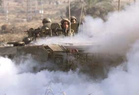 以巴衝突繼續升級,一架以軍坦克在硝煙中。(美聯社)