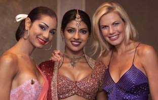 委內瑞拉小姐(左)、印度小姐和南非小姐(右)在倫敦的格羅夫納飯店向媒體的亮相。(法新社)