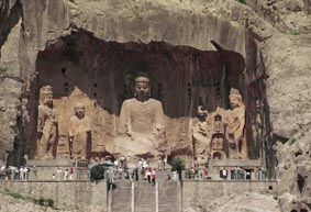 河南洛陽龍門石窟位於洛陽市東南,分布於伊水兩岸的崖壁上,南北長達1公里。