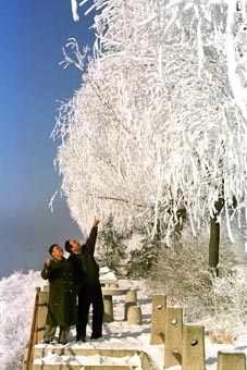 這是妙趣天成的雪掛觀讓兩位遊客驚嘆不已。(新華社)