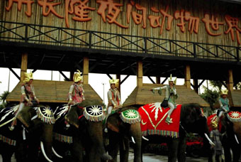 夜色降臨前,幾名來自雲南的布依族小夥子騎著大象在夜間動物世界迎接遊客。(新華社)