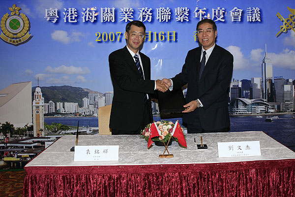 加強合作:香港海關關長袁銘輝(左)與國家海關總署副署長兼廣東分署主任劉文杰,簽署2007年度粵港海關業務聯繫年度會議紀要,加強雙方合作。