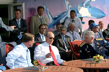 開幕式結束後,普京隨即前往俄國防出口公司展台,首先祝賀公司總經理切梅佐夫55歲生日,然後與來訪的烏克蘭總理亞努科維奇問候,之後前往觀眾席欣賞空中芭蕾特技飛行表演。一到觀眾席普京就脫掉了西裝,戴上墨鏡。亞努科維奇坐在第二排,旁邊是俄羅斯著名女飛行員卡帕尼娜,表演開始前,她在和總統的簡單交談中抱怨自己的退休金現在只有1048盧布,普京承諾一定要解決此事。