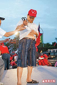【文匯專訊】中國台灣網9月10日消息 據台灣《蘋果日報》報道,自稱是「扁迷」的蔡芳樹,去年6月從南投北上參加「倒扁」,並焚燒自己的小貨車抗議,他昨天重返凱達格蘭大道,翻開上衣露出自焚的疤痕,突然掏出剪刀朝肚皮猛刺五六刀,工作人員奪下剪刀並報警。