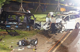【文匯專訊】臺灣臺北縣昨天深夜發生一起重大死亡車禍,一輛休旅車疑似跨越中線,逆向行駛,正面撞上對向1輛自小貨車及2輛機車,共造成2死5重傷1輕傷,現場一片凌亂,警方正鑑定調查肇事原因。