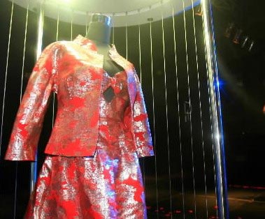 這件價值200萬元的禮服是由國際著名華裔設計師Vivienne Tam小姐設計的鉑金婚紗系列當中的一件。據介紹,整個鉑金婚紗系列共三件,製作時間超過一年,總價值650多萬元。此次在武漢展出的紅色中式禮服以中國式的裙褂為原型,融入現代時尚元素,服裝上所有的牡丹花均是採用鉑金絲繡制,整體看上去優雅華貴。