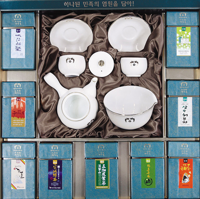 在10月2日-4日舉行的朝韓首腦會談上,韓國總統盧武鉉要送給朝鮮人士的九種傳統茶葉和茶具套裝。《朝鮮日報》全基炳攝