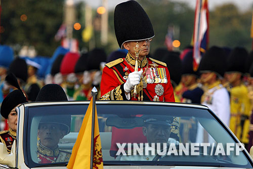 12月2日,在泰國首都曼谷的王宮前,國王普密蓬·阿杜德(前右)檢閱儀仗隊,以紀念自己的80歲生日。今年12月5日是普密蓬國王80歲生日。新華社/法新