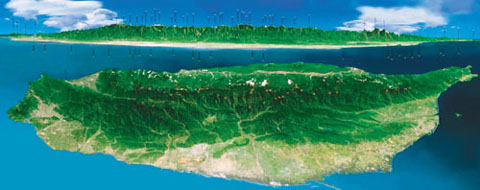 透過衛星影像,觀者可由任意角度看見湛藍海洋中的綠色台灣。以往由南北角度看臺灣,台灣像綠色「蕃薯」,現在我們從地平線角度更能看見台灣山稜的變換,發揮想像力,台灣的側臉還像只迷你「鱷魚」,大屯火山是鱷魚突出的鼻孔,崢嶸山稜是鱷魚的背,恆春半島是鱷魚擺動的尾巴,乘著黑潮在海洋中北遊而去。