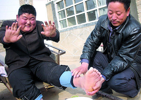 浩浩今年16歲,出生在橫山縣雷龍灣鄉雷龍灣村,父母都是普通的農民。他的父親老許說,兒子出生時個子就比別的孩子大,除了兩隻手和兩隻腳上各長有6個指(趾)頭外,其他都正常。等孩子上學前班後,才發現孩子視力也不好,可能是因為6指的緣故,他連握筆都很困難,「上了三年學前班後再沒上學」。幼兒時期的輟學給浩浩帶來很大的陰影。不僅如此,隨著年齡的增長,他的個子也達到1米75,體重270斤,腰圍1米33,巨大的體重讓他行動極為不便。