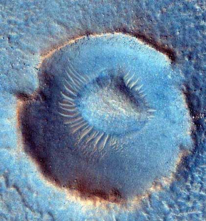 【文匯專訊】據美國宇航局太空網29日報道,火星勘測軌道器拍到的一張隕石坑的照片,看上去像一隻一眨不眨的藍色眼睛。