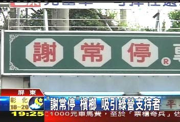 【文匯專訊】在台灣南部,除了有「長昌輪胎行」之外,還有一家檳榔攤就取名「謝常停」,寓意為「謝謝你常停下來」,正好是民進黨候選人謝長廷名字的諧音,顯眼的綠色招牌吸引不少綠營支持者上門。