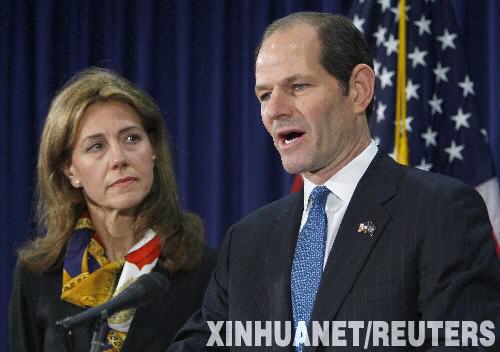 3月12日,在美國紐約的辦公室,捲入召妓醜聞的紐約州州長、民主黨人埃利奧特·斯皮策在妻子茜爾達的陪伴下向媒體宣佈辭去州長一職。這一決定將於本月17日生效。新華社/路透