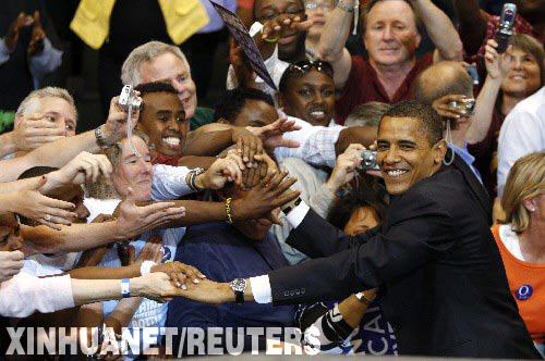 6月3日,美國伊利諾伊州聯邦參議員奧巴馬(右)在明尼蘇達州的聖保羅舉行的競選活動上與支持者握手。當天,美國南達科他州和蒙大拿州舉行民主黨總統預選,奧巴馬所獲得的將在民主黨全國代表大會上支持他的代表數已經超過2118名。這意味著他將穩獲民主黨總統候選人提名,成為美國歷史上第一個非洲裔主要黨派總統候選人。(圖片來源:新華網)