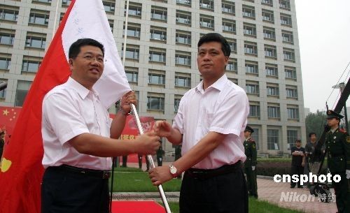 資料圖片:中國航天科技集團公司總經理馬興瑞(右)向「神舟」七號飛船總指揮尚志授發射試驗隊隊旗。(中新社圖)