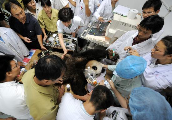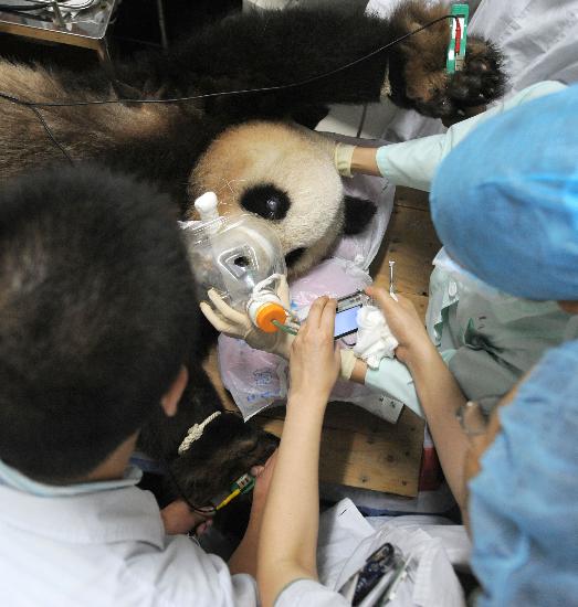 7月22日,南京軍區福州總醫院的醫務人員在為體檢的大熊貓給氧。
