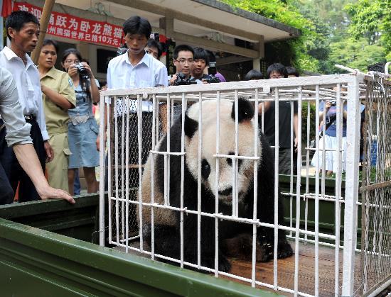 7月22日,在福州寄養的四川地震災區生病大熊貓被裝運上車前往醫院體檢。