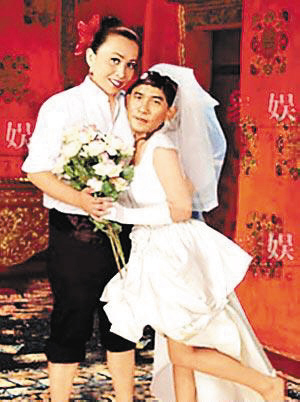 【文匯專訊】有網友就把兩人的結婚照惡搞一番。其中在不丹王宮拍攝的一幅,慘被網友變性,偉仔身穿婚紗依偎新娘,嘉玲則很新郎地攬著對方。(來源:信息時報)