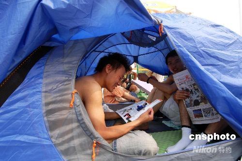 【文匯專訊】7月24日下午,北京的大學生搭著帳篷冒酷暑等待購買最後一批奧運門票。奧運第四階段門票銷售即將於25日正式開始,24日一大早就有大批民眾前往等候買票。(中新社)
