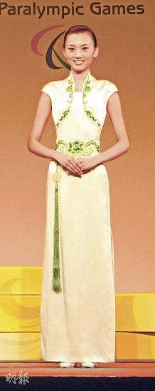 將於香港奧馬頒獎台上出現的「玉脂白」列禮儀小姐服裝,屬彩繡腰封和玉珮的設計,既代表中國玉文化,亦是創新的傳統旗袍設計。