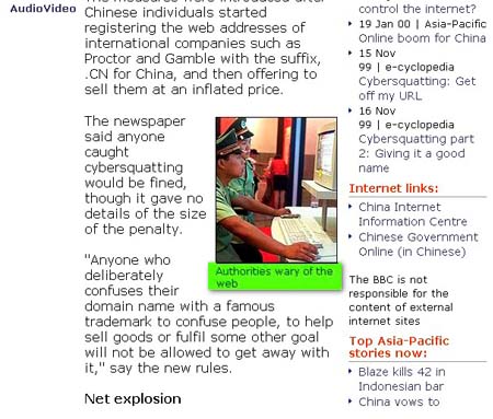 再往前追溯到2002年9月23日,BBC中、英文網站同時登出的一篇題為「中國加強網上監控的防火牆」的新聞中,相同的圖片被配以了「中國安全部門一直在監視上網活動」的註解。同樣在2001年7月20日,有關中國網絡監管的新聞中,再次出現相同的配圖。