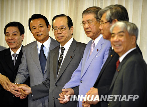 8月1日,日本首相、自民黨總裁福田康夫(左三)在東京自民黨總部和新任領導層成員握手。當天,福田康夫確定了自民黨新領導層人員構成,決定啟用前外相麻生太郎為自民黨幹事長。新華社/法新