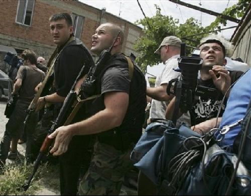 薩卡什維利總統的安保人員和攝影記者警惕地頂著天空,唯恐俄軍戰機來襲。
