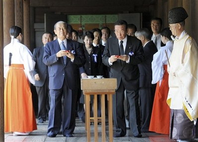【文匯專訊】8月15日是第二次世界大戰日本戰敗63週年紀念日。日本兩位前首相安倍晉三和小泉純一郎當天上午參拜了靖國神社,而現任首相福田康夫則前往位於東京都千代田區的千鳥淵戰歿者公墓獻花,向受害民眾表示反省之意。