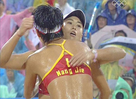 雨勢並未減弱,比賽也重新開始,第二局比賽上,美國選手開局就取得了5比2的領先優勢。有專家評論說「美國選手最大的特點就是沒有特點。」他們確實優秀,不管是進攻還是防守,防守時候有1.88米的梅,她是去年攔網排名第一,而沃爾什在後場的防守也很有經驗,她經常做出精彩的救球。好在現場無數的中國觀眾給了田佳/王潔支持,5比6,美國選手失誤後,中國隊逐漸追上了比分。田佳兩記ACES,幫助中國隊反超了比分9比8。中國隊的確頑強,這場大雨中精彩的對決,不管結果如何,相信這場比賽一定會成為歷史上精彩的一刻的。中國隊雖然又短暫落後於對手,但比分交替上升的兩隊將雙方分數提升到了12比12.雨大到選手已經快不能睜開眼睛了,但沙場卻仍然很乾燥,這可是從不遠萬里從海南運來的。這樣大的雨,兩隊選手的技巧性動作都很難用出來,比賽已經變成了力量與精神的較量了,王潔的攔網與田佳的輕調球幫助中國隊以15比13領先了。雨中的球很滑,這也導致了救球成功率及其低,雙方的失誤都送給對手很多分數。這也導致了中國隊的再次落後,15比17,但田佳的輕調球打在了梅的身後,中國隊追回了一分。雨是越來越大了,美國選手是否會再次失誤呢?她們失誤了,一次發球失誤,一次被王潔攔住。18比18,比分再次打平了。美國隊利用田佳失誤拿下到了局點,隨後她們進攻成功,21比18,美國選手繼2004雅典奧運會之後再次收穫了金牌,田佳王潔拿下了銀牌。