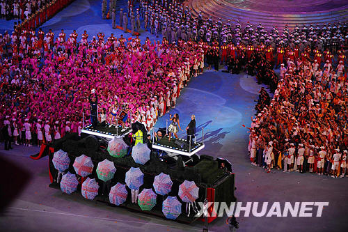 8月24日晚,第29屆夏季奧林匹克運動會閉幕式在北京國家體育場——「鳥巢」舉行。這是歌手在倫敦巴士上進行演唱,碧咸在展示足球。新華社