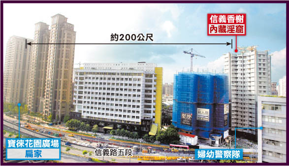 妓院就在「信義香榭」豪宅內,僅距陳水扁住所「寶徠花園」200米,且還開在台北市婦幼警察隊對面。
