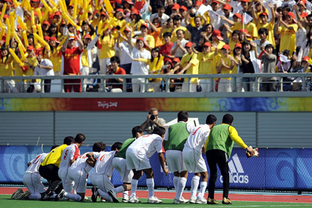 【文匯專訊】9月10日,伊朗隊球員在比賽結束後向觀眾致謝。當日,在北京2008年殘奧會七人制足球第一輪比賽中,伊朗隊以3比0戰勝英國隊。(新華社)