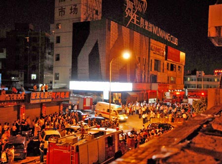 凌晨1時,記者趕到事發現場,舞王俱樂部佔地面積千餘平方米,被一片民房包圍,外牆看不出明顯的火災痕跡。廣告招牌依然亮著。記者進入三樓俱樂部大廳看到,地面上散落著許多女式涼鞋。俱樂部三四樓一片漆黑,玻璃窗全被打碎,窗口處被濃煙熏得一片漆黑,空氣中還凝聚著一股強烈的焦味。上完樓梯後有一條大約10米長的狹窄過道,在過道的地上全是逃生人員散落的鞋子。大廳中央是個表演舞台,大廳裡擺放著百餘張桌子,周圍有十多間包廂。大廳裡不少桌子、椅子被掀翻。