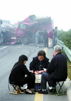 【文匯專訊】據新京報報道,3日早晨,河南省洛陽市西南環高速公路發生車輛連環相撞事故,造成3死7傷和20多輛機動車報廢或受損,高速公路西半幅因此中斷行車2.5小時。幾位乘客在高速公路車禍事故現場附近打撲克,等待事故處理完畢道路疏通。