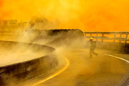現場指揮員根據觀察發現,槽罐車側翻在一高速公路上坡拐彎處,空氣中瀰漫著大量橙黃色煙霧,有強烈刺激性氣味,並隨著風向自西向東飄散。該槽罐車北側為綠化帶,南側有一排水渠通向25米外一條小河,同側200米處為居民區,有十數幢居民樓。