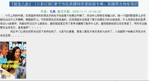 帖子並將「報道章子怡要發片的頭版消息」的雜誌封面上傳,言之鑿鑿表示確有其事。但網友們紛紛跟帖對此圖表示質疑,稱有PS的嫌疑,記者也沒有在本月的該本雜誌上查閱到帖子所述的相關內容。
