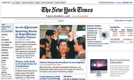 紐約時報在網站首頁登載陳水扁高舉被銬雙手的照片,配上他被控貪瀆洗錢的新聞。