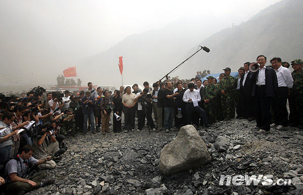 2008年5月24日,溫家寶總理重返四川地震震中汶川縣映秀鎮時接受中外記者的聯合採訪。新華社記者姚大偉攝