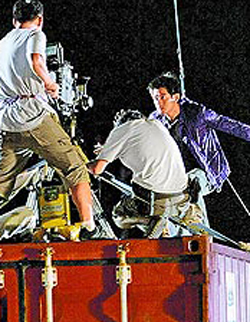 【文匯網訊】郭富城前晚在港加緊拍《全城戒備》殺青戲,吊鋼絲到2層樓高,再飛身跳到貨櫃車頂使出飛刀絕招,相當危險。