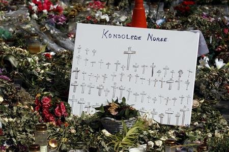挪威首都奧斯陸市中心擺滿了紀念爆炸槍擊事件遇難者的鮮花和各種紀念品。