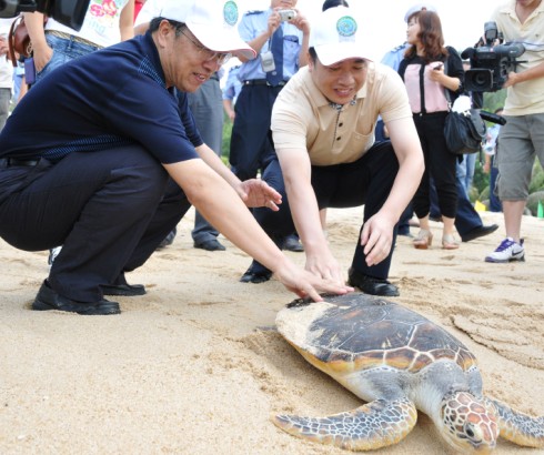 活動中放流的4只綠海龜,其中2只由北京市漁政監督管理站於2010年在檢查中解救。當時這2只海龜身體虛弱,身患疾病,北京漁政執法人員立即將它們送到北京太平洋海底世界進行救治,專家為其制定了詳細的飼養計劃,並配備專業飼養人員和設備。隨著2只綠海龜身體和精神狀況的逐漸好轉,在得到專家確認後,北京市農業局決定將它們放歸大海。北京市民給2只可愛的小海龜取名為「京京」和「粵粵」,希望它們帶著首都人民的祝福,從此健康、快樂的成長。