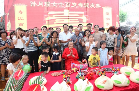 【香港文匯網記者於永傑 通訊員張丹 山東29日電】文登西樓社區居委會百歲老人孫月璞的百歲壽誕。遠自北京、廣西,黑龍江的52名後代子孫紛紛趕來,一家五世同堂200多人一起為為老人祝壽。