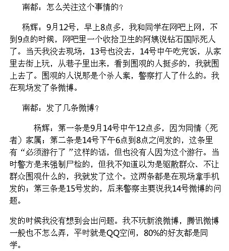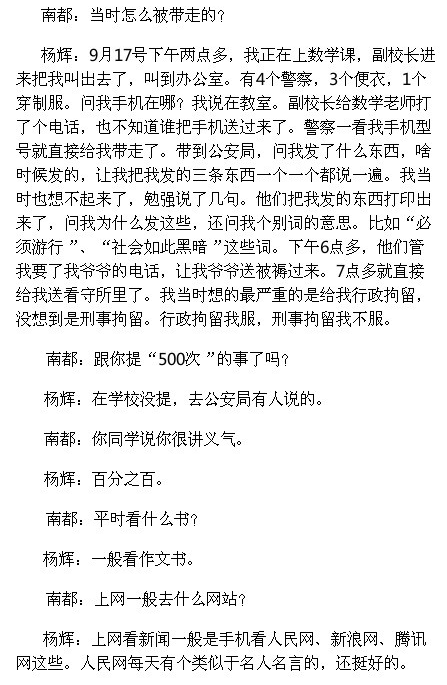 【文匯網訊】南方網消息,發微博被拘少年向南都講述了拘留經歷,說他并不後悔。「(警察)問我個別詞意思,比如『必須遊行』、『社會如此黑暗』。當時想最嚴重的是行政拘留,沒想到是刑事拘留。行政拘留我服,刑事拘留我不服。」「上網看新聞一般是手機看人民網、新浪網、騰訊網這些。人民網每天有個類似於名人名言的,還挺好的。」