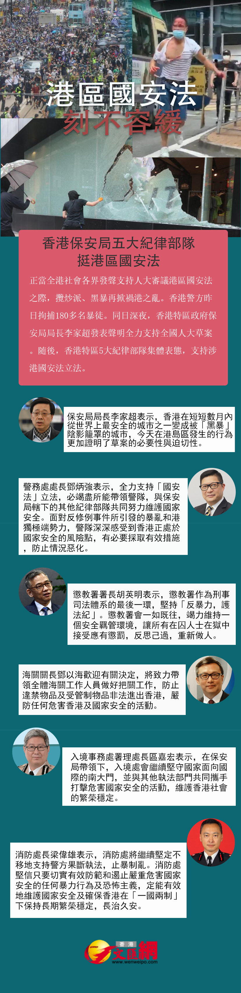 【文匯網訊】正當全港社會各界發聲支持人大審議港區國安法之際,攬炒派、黑暴再掀禍港之亂。香港警方昨日拘捕180多名暴徒。同日深夜,香港特區政府保安局局長李家超發表聲明全力支持全國人大草案。隨後,香港特區5大紀律部隊集體表態,支持涉港國安法立法。