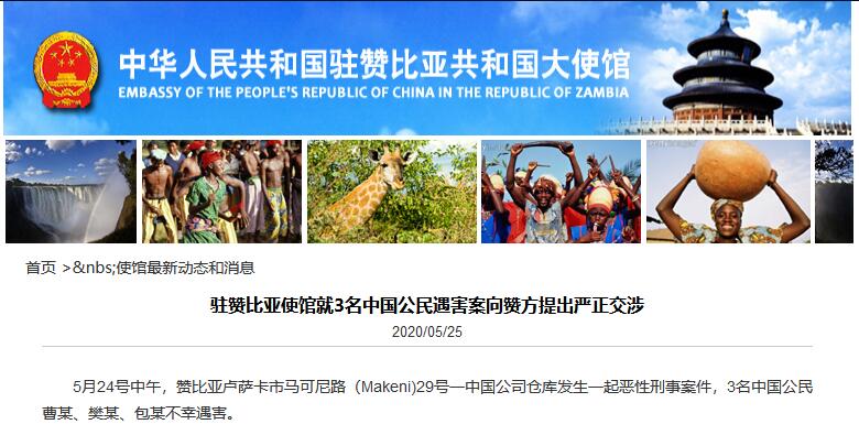 【文匯網訊】據中國駐贊比亞共和國大使館官方網站25日消息,5月24日中午,贊比亞盧薩卡市馬可尼路(Makeni)29號一中國公司倉庫發生一起惡性刑事案件,3名中國公民曹某、樊某、包某不幸遇害。