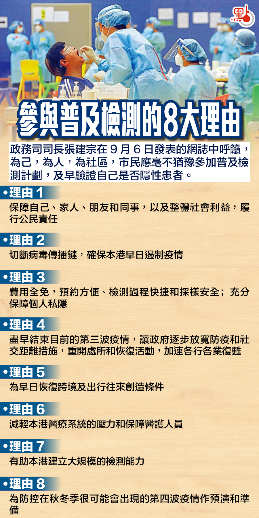 【文匯網訊】大公文匯全媒體報道:政務司司長張建宗在9月6日發表的網誌中呼籲,為己,為人,為社區,市民應毫不猶豫參加普及檢測計劃,及早驗證自己是否隱性患者。